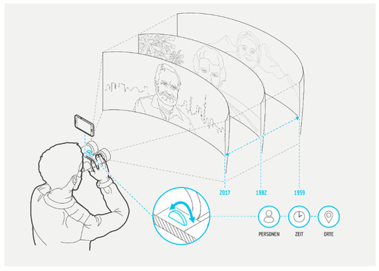 Unintended interactions, such as “zooming” too far, were easy to correct. All participants understood the bidirectional navigation through the content with the wheel. Five out of six participants understood the time-travel metaphor immediately, but some initially struggled with the concept of “zooming” into the past which was supported visually (images where enlarged gradually).