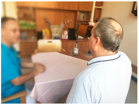 The “Binoculars” prototype was tested in November 2017 in a daycare center for geriatric diseases in Berlin, Germany. During the course of half a day, six participants were encouraged individually to use the “Binoculars”. They were all accompanied by one of their caregivers (always the same professional, experienced in reminiscence therapy). The participants were of heterogenous age (M = 74.67, SE = 5.71; range = 55–91). Female (n female = 3) and male (n male = 3) participants were represented equally. Four out of six participants were explicitly diagnosed with forms of dementia. The other two were not unequivocally diagnosed with a specific form of dementia, but showed similar cognitive impairment according to data of the daycare center. The sessions were held in a separate room and lasted from 12 to 20 minutes (M = 15.33, SE = 1.31). All sessions were observed by the same researcher. A second caregiver was present but passive. The setting for the tests is depicted in Figure 11.
