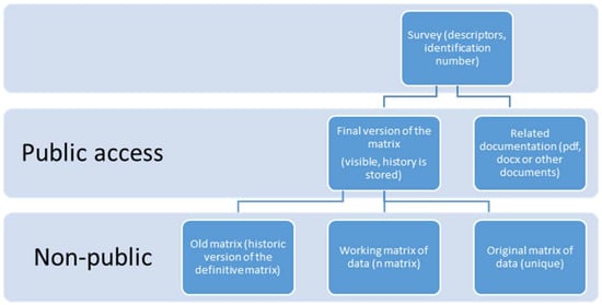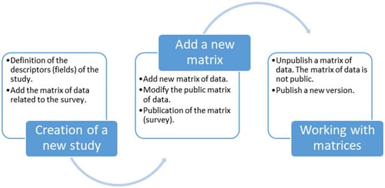 Additionally, some fields of the dataset of the survey might not be made available to the public (due to anonymity concerns); hence, some transformations to the data must be performed to guarantee that the registers are properly anonymized. After this is performed, different versions of a study can be published; for example, to correct or clean errors in the data. However, the public must only have access to matrices of data that pass the necessary quality controls, while the rest of the matrices are stored on the system as working matrices which are not accessible to the general public. The life-flow of a study is shown in