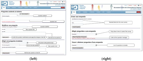 In our proposal, the relations between the various questions that compose the questionnaires must also be defined; this information (which can be stored in the database for its posterior use) helps us in the review of the complete history of the questions. The answers to the various questionnaires and the history of changes are also available. For example, if we include a question such as “Which party would you vote for in the next election?” and in a new version of a questionnaire, this changes to “If elections were to be held tomorrow, which party or coalition would you vote for?”, we must keep the relation between both questions, indicating that they represent the same underlying concept. This simplifies the statistical use in the operations tool, merging the information to construct, for example, a time series.