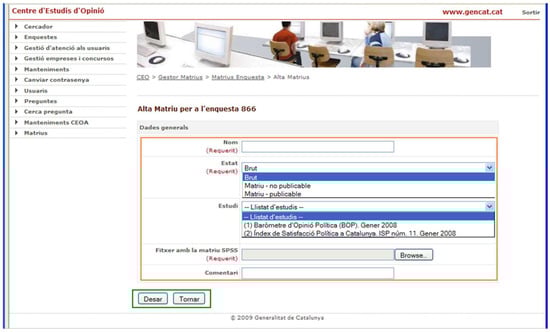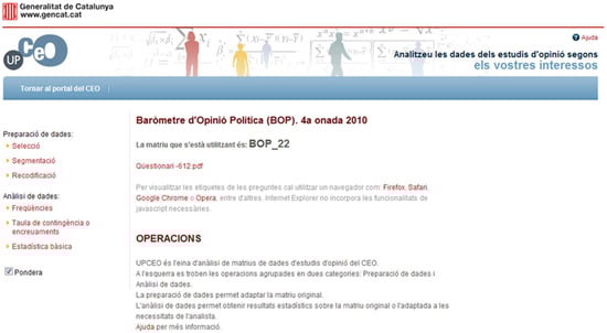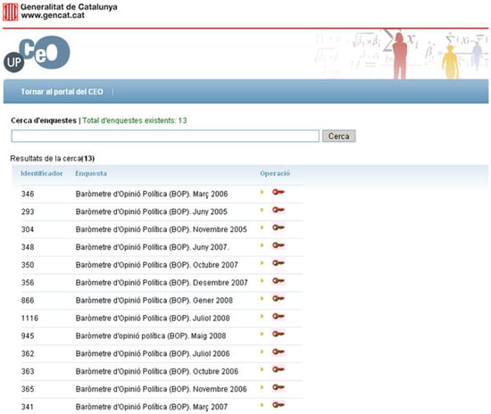 Generalitat de Catalunya require. This infrastructure is maintained by a licensed private enterprise (currently T-Systems). This is convenient for the project because, when the CEO releases a new study, the quantity of resources required to supply the punctual demand can be bigger than the resources required in a usual day. Additionally, because CTTI ensures that the system is working 24/7, it can be convenient for the daily work to provide the infrastructure for the CEO database to store all the information regarding the studies. The CEO primarily manages surveys related to political public opinion. The studies derived from these surveys are published on the CEO website to ensure that the public has knowledge about them.