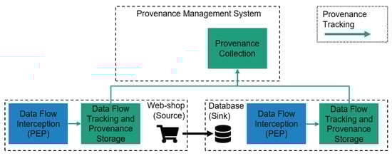 Figure 1 shows an exemplary data provenance tracking architecture. In the example, a webshop transmits customer data from its frontend to a database. Both systems have to be extended with a component, which observes outbound and inbound data flows. Speaking in terms of the well-established conceptional architecture of eXtensible Access Control Markup Language (XACML) [