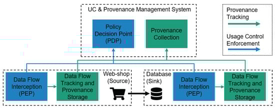 Figure 2 extends the webshop example from the previous section with an additional usage control component, the so-called policy decision point (PDP). The PDP evaluates events intercepted by PEPs against usage control requirements specified in policies. As already stated for data provenance tracking, all software systems that are able to collect, alter or store data have to be extended with PEP functionality.
