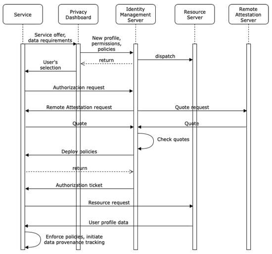 Section 5). In the first step, we assume that a service transmits a service offer to the privacy dashboard, which describes the kinds of data the service provider wants to access or to collect before/while performing its service. The service offer also includes information concerning whether it supports data provenance tracking, usage control enforcement, or remote attestation. In case the service is provided via a website, we assume that this website will allow the user to direct it to the identity management infrastructure, e.g., by entering an uniform resource identifier (URI) of a communication endpoint of the identity management infrastructure. The user will then open the privacy dashboard to create or update his user profile for the given service. He can set permissions concerning live data acquisition to be performed by the service and also concerning resources he wants to provide to the system by granting access to an external resource server. The former is particularly relevant when we think of interactive assistance systems, which learn certain characteristics of the user while he is already using it, i.e., by evaluating and exploiting data collected by various sensors. In case some service requires an additional identity attribute, which is not yet stored on any attached resource server, the user can add this attribute via the privacy dashboard and directly dispatch it to an existing resource server. Any permission or newly added attribute is automatically synchronized with the resource server responsible for the respective resource. In case the user wants to specify usage restrictions concerning his data, he also needs to choose according usage control policies, e.g., he wants his heart rate related data to be deleted by the requesting service after a trial period of seven days. Finally, a reply containing the user’s service selection is sent to the service.
