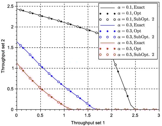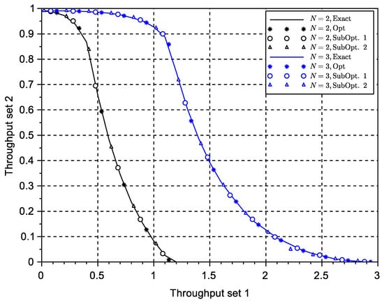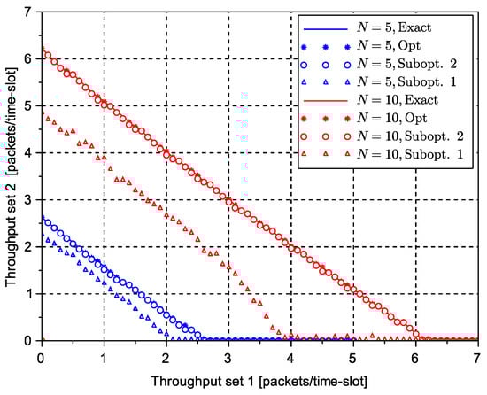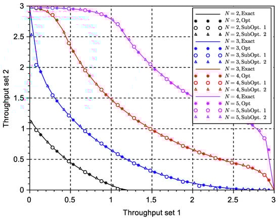 This section presents the sketches of the throughput region for different network settings that will corroborate the main derivations and conjectures stated in this paper. It is worth pointing out that the sketches in this section are bi-dimensional, and the system parameters have been set here to fit this restriction. The throughput region of J terminals is, in the strict sense, a J-dimensional figure, and therefore, many of these higher dimensional features cannot be represented graphically in a two-dimensional space. The first set of results was obtained for a network setting with terminals split into two subsets of three terminals each. All terminals in each set will experience the same queuing statistics. The results were obtained with the N-reception model with different values of . The Pareto frontier sketches of the boundary of the throughput region were obtained by setting one of the transmission probabilities as variable in the range and then solving the other transmission probability(ies) from the Pareto frontier optimum or sub-optimum expressions using well-known numerical methods for solving equations. The results of the throughput of the two sets of terminals were simply obtained by substituting the optimum or sub-optimum transmission probabilities in the expressions for packet throughput in (3). The results can be observed in Figure 2. The figure shows the exact solution obtained by exhaustive search computation, the optimum solution from the determinant equation set to zero in (9), the sub-optimal solution in the Expression (12), labeled as Subopt. 1, and the suboptimal solution in (16), labeled as Subopt. 2. It can be observed that in all cases, the suboptimal solution in (12) provided an almost exact approximation, even for cases where . By comparison, the suboptimal solution in (16) showed a better fit when the curves were near the point of statistical identity between the two subsets of terminals () and showed deviation at the edges of the main envelope curve where or .