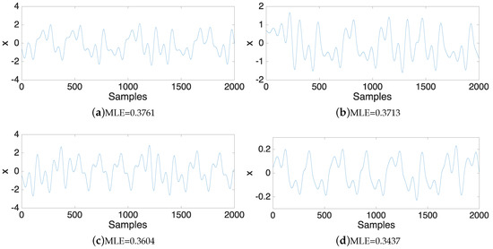 This chaotic oscillator was implemented using an FPGA, as already shown in [20]; their coefficients were varied as shown in [21,22,23] in order to maximize MLE, which is related to the unpredictability of the chaotic time series data. For instance, Table 1 lists the coefficient values associated with eight different MLE values. Figure 1 shows examples of chaotic time series corresponding to the state variable x and with different values of MLE. In this work, the time series data of this state variable x are used to predict future behavior of six and 12 steps ahead. The amplitudes of all the chaotic time series data are normalized in the range .
