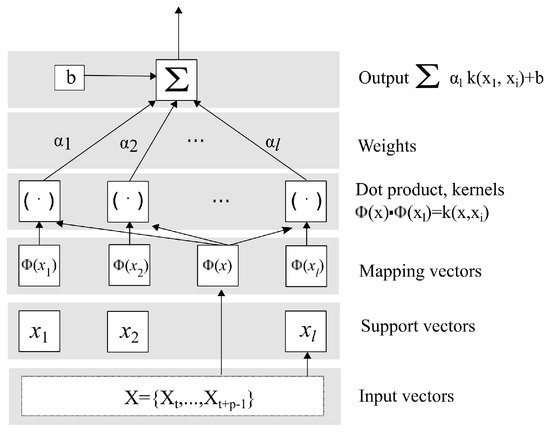 The prediction of time series using least-squares support vector machines (LS-SVM) is done using a set of historical values of time series as inputs and a single output as the target value. When the prediction of the time series is developed by SVMs, given time series data composed by a set of consecutive real values , the prediction is represented by dividing in windows of size p, in order to find a function . The radial basis function is used as a kernel function because it provides excellent performance under assumptions of general softness [27]. In the space of characteristics, LS-SVM has the form , where is a vector of weights. Figure 4 shows a functional structure detailed in [28].