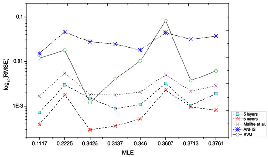 Considering the previous results, the MLPs with five layers and six layers are selected to predict the eight chaotic time series, but now to achieve a twelve steps ahead horizon. Figure 6 shows the RMSE obtained during the validation stage, again for the eight MLE values associated with the chaotic time series from Table 1.