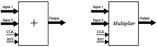 VHDL block descriptions of the adder and multiplier including clock and reset pins. CLK, clock; RST, reset.
