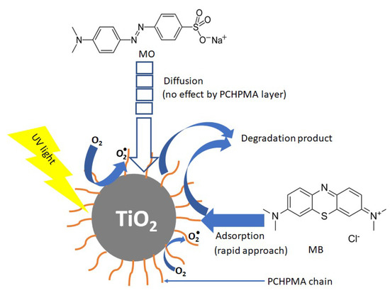 The photocatalytic activity of a semiconducting photocatalyst highly depends on the surface modification and the band energy structure. For example, modifications of TiO2 with silane coupling reagents including MPS decrease the surface modification the photocatalytic activity probably by the blocking of active catalytic sites [64,65]. Figure 10a shows the UV-vis absorption spectrum of PCHPMA. The maximum absorption peak and the onset wavelength appeared at 218 and 244 nm, respectively. These wavelengths are shorter than the wavelengths of the UV emission lines of the Hg lamp (253 and 365 nm). This result indicates that PCHPMA does not contribute to the light absorption. The band gap calculated from the onset wavelength is 5.1 eV. Figure 10b shows the CV curves of TiO2-PCHPMA, TiO2, and PCHPMA in 0.1 M NaCl aq. A peak reduction of TiO2 was observed from –0.38 V with respect to Ag/AgCl, agreeing well with reported values [8,66,67]. The reduction potential of TiO2-PCHPMA was observed from −0.28 V with respect to Ag/AgCl, while no peak was observed in the voltammogram of PCHPMA. The small positive shift (+0.1 V) suggests the slightly higher and lowest unoccupied molecular orbital (LUMO) level of TiO2-PCHPMA due to the change of the chemical structure of the surface of TiO2, but the effect can be ignored on considering the lower catalytic abilities of reported TiO2 modified with silane coupling reagents. Accordingly, the primary photocatalytic reaction was not enhanced by the modification. The enhanced degradation occurred by the rapid adsorption of MB on the PCHPMA layer around the surface of TiO2 in a similar manner to TiO2 modified by polyacrylamide [34], poly[acrylamide-co-(acrylic acid)] [40], and NH4OH [52]. A plausible mechanism for the degradation of dyes in the presence of TiO2-PCHPMA under UV irradiation is displayed in Figure 11. The PCHPMA chain grafted on TiO2 attracts cationic MB to allow the rapid approach of MB over the surface of TiO2. Adsorbed MB is smoothly degraded by oxidation species such as O2. By contrast, anionic MO does not interact with the PCHPMA chain, and approaches the surface of TiO2 by diffusion. As a result, the degradation of MO proceeds identically to TiO2 and TiO2-PCHPMA.