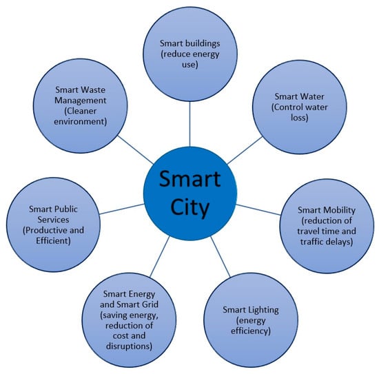 According to Bakici et al. (2012), a “smart city is a high-tech intensive and advanced city that connects people, information, and city elements using new technologies in order to create a sustainable greener city, a competitive and innovative commerce, and an increased life quality” [3]. Many application areas for sustainable development in smart cities were referred to above. Sustainability could be achieved in any of these areas. Consolidating supportable advancement and urbanization issues, regions of reasonable urban areas can employ enthusiasm, training, strategy making, and organizations, an intrigue shown in all parts of society. In the scholarly world, it can be seen in journals, college instructions, and projects particularly dedicated to tending to reasonable urban improvement. People responsible for approaching the apparent requirements for maintaining capable urban improvement can be found in worldwide discussions, sanctions, and associations, in national projects and focuses, and also in neighborhood far-reaching designs and natural projects [38]. Sustainable development was also defined by researchers as “achieving a balance between the development of the urban areas and protection of the environment with an eye to equity in income, employment, shelter, basic services, social infrastructure, and transportation in the urban areas” [39]. Moreover, alongside sustainable development, researchers stated a city as being smart “if its conditions of production do not destroy over time the conditions of its reproduction” [40].