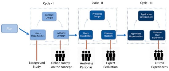 In Cycle 1, ground knowledge is gathered and a concept is constructed on the basis of that knowledge, before being evaluated through users—in this case, the people living in the city. The outcome of the first cycle is a validated concept that is based on some real needs. In the second cycle, the requirements of the stakeholder are analyzed for the prototype design. The survey outcome from the previous cycle is combined at this stage to produce a visual representation of the service to demonstrate it to the users who are the inhabitants of that certain area. The outcome of the second cycle is a visual prototype that should be easy and intuitive to use and that would serve the needs of the users. The third cycle focuses on the implementation of the prototyped concept. Users and other stakeholders play an important role during each cycle for the evaluation and validation of outcomes.