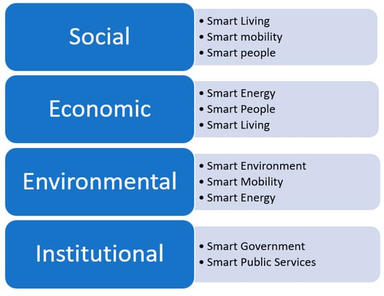 Quick-paced urbanization resulted in urban communities representing over 75% of worldwide vitality utilization and 80% of the aggregate greenhouse gas (GHG) emissions, due to the arrangement of general worldwide asset utilization occurring in urban communities. Urban communities with supportable improvement demonstrated noticeable quality, and the idea of practical urban areas received noteworthy political force worldwide as the focal concentration in driving overall maintainability [3]. Although in most cases sustainability is described in terms of the environment, one should not forget the other dimensions, e.g., economical and social. The areas of smart cities are also diverse; thus, they should be properly mapped with the appropriate dimension of sustainability. In a previous paper [3], the traditional dimensions of sustainability (ecological, economical, and social) were modified to meet the challenges of a smart city by also considering the institutional dimension (see Figure 3). It can be seen that the same areas of smart cities are related to different dimensions of sustainability. For example, smart living influences the development of social life, as well as economic factors, as smart buildings help reduce energy costs.