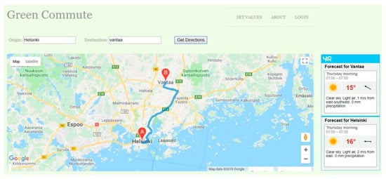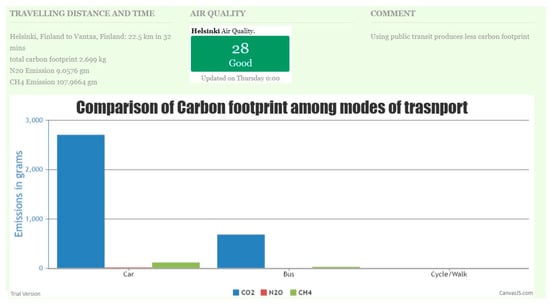The motivation for this step-by-step approach was to understand the needs of the inhabitants of the city and to involve their choices throughout the design and development phase. Appreciating the survey results and usability evaluation, it was understood that, in the case of the Green Commute service, the expected user’s primary requirement was the use of an existing service, and the secondary requirement was the environmental data (carbon footprint, air quality, weather) that best matches with the primary requirement.