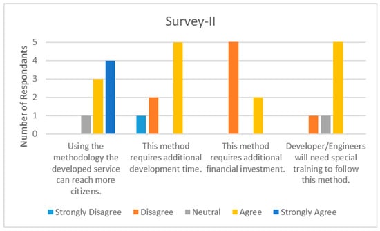 The living lab methodology used in this research followed the Form IT model proposed by [16]. The implementation of the model has been presented in previous section in detail for the development of the Green Commute web application. As presented in Figure 2 the stakeholders were actively engaged during the development process; first in concept development, then in prototyping and finally in application evaluation. Concerning the methodology used a set of 8 software developers and engineers were surveyed of the usability of the used Form IT model. The survey was conducted over online voice calling service. Their point of view is presented in the Figure 8. Based on the answers the approach would be useful to get attention of the people living in the city, as inhabitants of the city will be involved in the innovation and design and they can learn about the service beforehand its deployment. On the other hand, it is expected from the respondents that the developers or engineers would have to give special attention and need extra training to follow this process to develop sustainable smart city services.