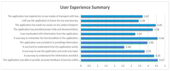 The second research question focuses on the experiences of the users with the actual application and their improved sustainability knowledge. Figure 9 explains the overall user experience with the developed application, which represents the combination of environmental data with the smart city application. Users were given a set of 11 statements, and they had choices to mark the statements on five levels based on their feelings regarding the application—level 1, strongly disagree; level 2, disagree; level 3, neutral; level 4, agree; level 5, strongly agree. According to the design principles explained earlier, a system should provide information within a reasonable amount of time and, from the summary, it can be inferred that most users agreed that the feedback on the journey was received in time. Although users had a neutral feeling about the access control of the application, they agreed that the information provided was easy to understand. The application also had good correlation with the real world and it was developed with inspiration from a map application. Thus, it was not hard to understand the work procedure of the application, and the users disagreed on the statement that the application was tough to follow. The consistency of the application was also admirable, as users agreed that it was understandable, as the results of the service depend on various open source APIs, which have their own criteria and specification of providing information. Later, it could be perceived that users were positive in recalling the functionalities of the application and its resources. Alongside user experience, it was also verified whether the idea of such a service would be helpful to allow inhabitants of the city to choose a better mode of transport in terms of environment sustainability, and most users were positive in this regard.