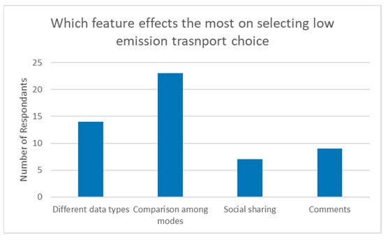 Although it was impossible within the timeframe of the research to evaluate the long-term impact of the Green Commute application as such, it was still possible to see the effect of environmental data on the users participating in the evaluation process. Alongside user experience, respondents were also asked to choose, according to them, the most effective feature to motivate them to select the mode of transport with low carbon emissions. The Green Commute application has four features that passively motivate sustainable behavior: different data types on the surrounding environment, comparison among different modes of transport according to their quantity of air pollutant emission, social sharing of personal choice, and comments provided through the system. It is noticeable from Figure 10 that users tend to actualize real data and comparisons rather than social sharing and static comments. They prefer visualization of pollutant levels for different modes; as the graphical representation used in the system was best suited for both experienced and inexperienced users, the result was obvious.
