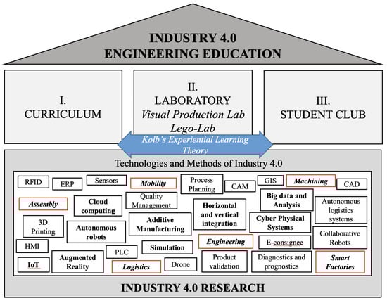 Industry 4.0 took up a pioneering role in industrial IT, which is currently revolutionizing the manufacturing engineering. Many industrialized countries also have already begun with adapting their industrial infrastructure to meet the requirements of the Industry 4.0 vision. An important part of the tasks in the preparation for Industry 4.0 is the adaption of the higher education to the requirements of this vision, in particular the engineering education. As Turkish German University (TGU) within this changing industry environment, our ultimate aim is to educate outstanding engineers who will contribute and grow with the digitalized world of the future. In this work, we introduce a road map consisting of three pillars describing the changes/enhancements to be conducted in the areas of curriculum development, laboratory concept, and student club activities. We also report our current application of this road map at the Turkish German University, Istanbul. According to this, first pillar is the implementation of the Industry 4.0 concept in the curriculum of various engineering and science departments, which reveals synergistic benefits of different expertise areas and helps the application and improvement of Industry 4.0 concept in numerous areas. Second, a Laboratory (Lego-Lab) is to be realized, where the students work on Industrial Lego Designs using Lego Mindstorms and understand the application of the Industry 4.0 concept by simulating real production lines. Additionally, Kolb’s Experiential Learning Theory is integrated into this part in order to improve student learning experience in Lego-Lab. This theory is designed around four phases: (i) Concrete experience, (ii) reflective observation, (iii) abstract conceptualization, and (iv) active experimentation. The final and complementary pillar is the establishment of a student club, where students work on different aspects of Industry 4.0. In addition, this club serves as an intermedium for various student and research projects, organization of conferences, and events to introduce and disseminate the Industry 4.0 vision.