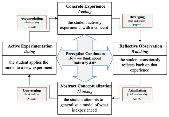 In the literature, different theories of learning are listed [], but some learning methods are more commonly used for engineering education [,,]: Kolb’s experiential learning theory [], Felder and Silverman learning theory model [], Honey and Mumford learning theory model [], VARK learning theory model [], Cognitive Theory of Multimedia Learning [], and so on. These methods could be used as the viewing lens to better understand learning and, more so, how applicable it is to information and communication technologies within the frame of Industry 4.0 vision in the current stage of the engineering learning institutions. The experiential learning method creates an environment that requires the participant to be involved in some type of personally meaningful activity. Such an environment allows the participant to apply prior knowledge of theory and principles while developing commitment to the exercise and experiencing a real sense of personal accomplishment or failure for the results obtained []. In order to bring change in behavior, attitudes and knowledge, a circular four-stage experiential learning cycle model developed by Kolb [] is used. This model is selected as a most suitable learning theory to adapt engineering education in Industry 4.0 vision. Kolb’s Experiential Learning Theory depicted in Figure 2 provides a framework for designing active, collaborative, and interactive learning experiences that support this transformational process and puts emphasis on sensory and emotional engagement in the learning activity. Effective learning is seen when a person progresses through a cycle of four stages: (i) having a concrete experience followed by (ii) observation of and reflection on that experience which leads to (iii) the formation of abstract concepts (analysis) and generalizations (conclusions) which are then (iv) used to test hypothesis in future situations, resulting in new experiences. Not only do these four stages allow students to comprehensively investigate a topic through different activities and views, they also allow for the accommodation of different learning styles []. According to Kolb [], knowledge results from the interaction between theory and experience and learning can commence at any of the four stages. Learning styles are a product of two pairs of variables, doing vs. watching, and thinking vs. feeling. Each stage can be mapped to these variables [].