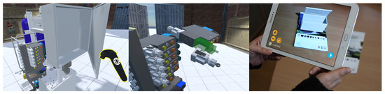 (Left,Middle) Virtual Reality (VR) for assembly and disassembly verification; and (Right) Mixed Reality (MR)-supported tool showing step-by-step instructions on a tablet-PC.