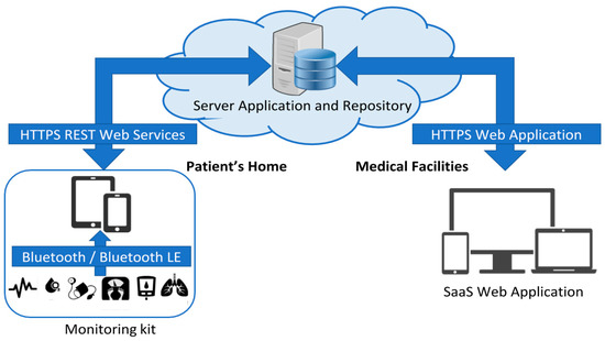 The proposed system is composed by several monitoring kits distributed on the territory, precisely at patients’ home, and a centralized server software application with storage capabilities, usually installed in the service provider facility. The bi-directional communication among these subsystems goes through the Internet network, exploiting broadband communication technologies (i.e., 3G, 4G, 5G, or WiFi connection to existing access-points). The overall client-server architecture of the system is shown in Figure 1.