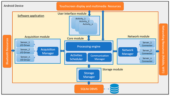 The two types of gateway rely on different software applications. They have the same software architecture and mainly differ for the implementation of the user interface module. Both versions have been implemented with the native Android SDK and are compatible with commercial smartphones and tablets with operating system (OS) version ≥ 4.3. The applications require devices equipped with dual-mode Bluetooth chipset, network connectivity (i.e., Wi-Fi and mobile broadband) and at least 4 GB of storage memory for local storage of data. In terms of processing power and RAM memory, they do not require any resource in addition to those required by the Android OS version running on the chosen device.