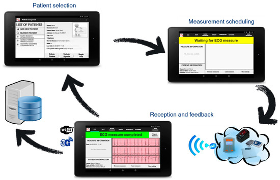 Considering telemedicine systems for chronic patients in the research literature [21,22,23,24,25] or present on the market [26,27,28], it is possible to note that they often provide only a partial support of scenarios suitable for the out-of-hospital monitoring of chronic patients. Instead, the proposed system includes on the same service platform all actors (i.e., care team), all relevant data in integrated way and all the possible scenarios involved in personalized healthcare service provisioning. In particular, the proposed solution meets three main telemedicine scenarios: (i) the patient self-acquisition scenario (i.e., one specific monitoring kit for each patient); (ii) the doctor’s visit scenario (i.e., a dedicated monitoring kit operated by professional caregivers to manage a set of patients); and (iii) the point of care scenario (i.e., specific acquisition equipment hosted in specific building like a pharmacy or a residence for elderly people). A patient can be treated with a combination of different scenarios depending on his/her conditions. Within each scenario, kind and frequency of data acquisition can be configured according to the patient’s needs; and the acquired data are immediately made available to the patient’s care team members.