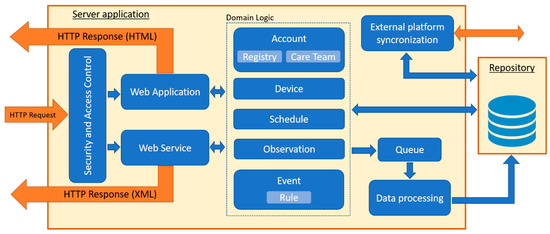 The web services module manages the endpoints that allow the gateway to exchange contents with the server application according to the REST paradigm. This module uses a custom XML schema for the request-response messages validation. Operations that requires data writing into the repository (e.g., upload of data collected by the gateway, etc.) are buffered through a FIFO queue and served asynchronously by the data processing module. Instead, query requests for data are immediately served (e.g., download of patient care plan, daily activities, summary information, etc.).
