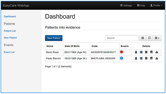 Concerning the web application GUI, Figure 6 shows the clinicians-specific landing page, presented by the system immediately after a successful login procedure. This page highlights the patients that needs immediate attention, providing for each of them the highest-level pending alarm to be managed. Moreover, the page enables the user to easily access to the functionalities offered by the system. The main functionalities are further described in the following subsections.