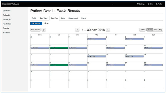 The care plan management feature offers to the care team the possibility to schedule periodic monitoring activities of specific vital signs. Figure 7 shows the GUI page dedicated to the care plan management, were a complete perspective of the activities involving the patient is offered to the user.