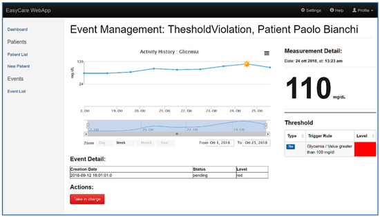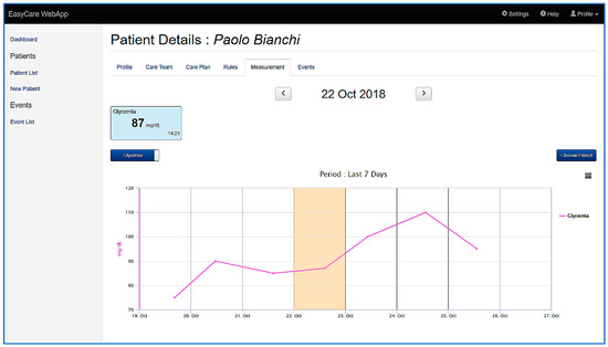 The application user interface enables care team members to monitor vital signs, signals, lifestyle parameters and questionnaire answers coming from patients’ activities by means of specific reporting pages. As an example, Figure 8 shows a chart that reports the seven-day trend of the measurements of the sugar level in blood.