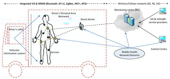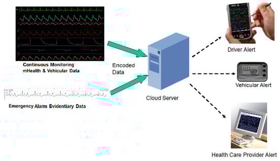 With the advancement of Internet of Things (IoT) and mobile health (mHealth) technologies, intelligent wearable devices could help monitor the health parameters of long-distance drivers in real time. However, there is a lack of trust and health education in adopting mHealth solutions that can be integrated with vehicular information systems (VIS). Since mHealth network resources have constraints of battery power, it is not practical to implement a full capacity security system. For example, an attacker may intervene the data transfer from the smartphone to the cloud as a man-in-the middle attack, and a time-based verification model to detect the MITM attacks [] can be utilized to handle this situation. This paper is aimed to address these issues by applying an integrated approach to both the driver health monitoring system as well as the vehicle safety system using mHealth devices such as wearable devices utilizing a lightweight security framework. Figure 1 depicts the idea of integrating an mHealth network with a VIS that collects road and vehicular information to connect with smart devices, which are a medium to mHealth. It is intended to use the mHealth network to transfer data from sensors to a cloud server via a smartphone, which integrates the VIS into the mHealth network. Hence, the information flow and security measures are mainly focused on the mHealth application rather than the VIS, which transfers data to the smartphone.