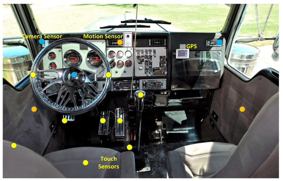 In general, long distance drivers are referred to as over the road (OTR) drivers or long-haul truck drivers who drive for long periods of time with minimal resting periods, e.g., 5.5 h with 15 min of rest, 8 h for half an hour and 11 h with a 1-h break []. When driving, drivers are in a seated posture and are relatively sedentary with little movement as compared to being out of the driver’s seat. Therefore, health-related data (HD) such as heart rate (HR), respiration rate (RR), blood pressure (BP), body temperature (BT), Electrocardiology (ECG), Electroencephalogram (EEG), Electromyography (EMG), and Blood Oxygen are expected to have little variation over this long duration and may show consistency. In addition, there may be some unique patterns that emerge with little variance in the driver’s health data, which can be implicated in the detection of emergency situations by integrating evolving and emerging technologies such as the mHealth network, personal health devices (PHD), biosensors, wearables, contactless sensing for vehicular applications, and emergency alarm systems.