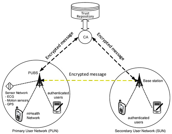 In our architecture, a certification authority is an entity that is connected to the PUBS and secondary user base station (SUBS). The CA will act as a trust repository for every node in the mHealth network for trust calculation, and it issues certificates for all members. Both SUBS and PUBS have full trust on CA.