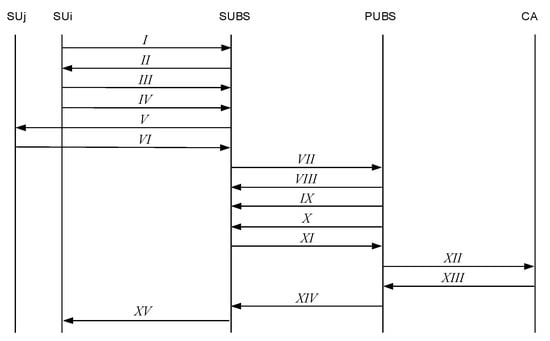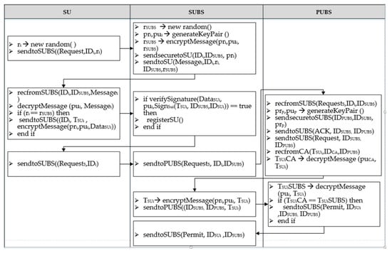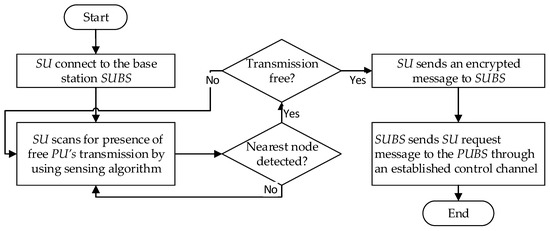 Both primary and secondary nodes are connected to their respective base stations. The secondary user uses a sensing algorithm to detect the presence of a primary user’s transmission. If the transmission is free, it sends an encrypted message to SUBS. After the message has been decoded and detached from the signature, SUBS sends the SU request message to the PUBS through an established control channel. This flow is depicted in Figure 6.