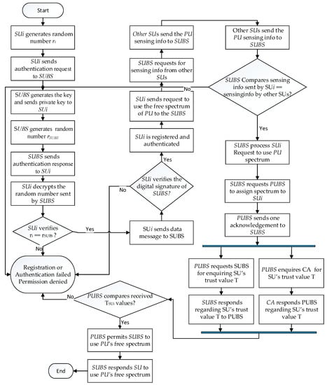 The authentication procedure is shown in Figure 7 for each step. Figure 8 illustrates the workflow of the working procedure using a digital signature to use PU’s free spectrum.