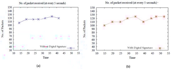 The snapshots of the ns-2 environment in Figure 10 presents the required time against the packet size of the transmitted message without an authentication process and with the authentication process from SUBS to PUBS in the mHealth network. It is observed that message transmission with authentication requires a longer duration of time in comparison to transmitting without the authentication process. However, it is more secure. Therefore, it increases the difficulty for adversaries to obtain the private key from a known public key and to slow down the network performance.