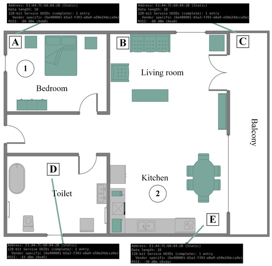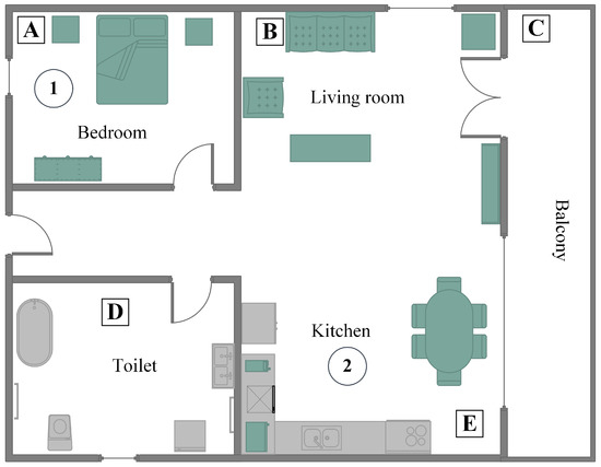 In Figure 1, a typical household is depicted, including an entrance (door at the left of the figure), a short hall giving access to a bathroom, a bedroom, and the living room, which includes a kitchen. A balcony is also part of the household. Smart speakers are placed in the interior of the house, covering all rooms, as well as exterior locations, such as the balcony. Speakers are illustrated as squares named A–E. Furthermore, a router connecting the home network with the Internet is implied, although not illustrated for simplicity reasons. For a better description of the use cases, two locations that are circled and enumerated are provided. These are potential locations where the sufferer may be found.