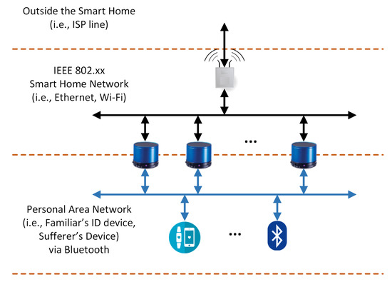 The speakers’ network at the smart home is the bridge between the user interaction and the cloud service. Each smart speaker is connected via both Ethernet/Wi-Fi and Bluetooth. The topology of the smart speakers’ network is depicted in Figure 5. As can be seen, any device from the users (either Familiar or Sufferer) is connected to the speakers, and through them to the cloud. Access to the cloud is achieved via the in-house installed ISP router.