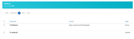 The first one is defined by the administration procedures. These procedures include the creation of a user (Sufferer or Familiar), the inclusion of Familiars on a Sufferer’s list, the association of sound files between user pairs and, finally, the management of the smart speakers (i.e., registration and removal of a speaker). Furthermore, it includes also the registration of hardware (for identifying the user’s ID, like a wristband or a smart phone of a familiar, or a digital ID device for monitoring the sufferer).