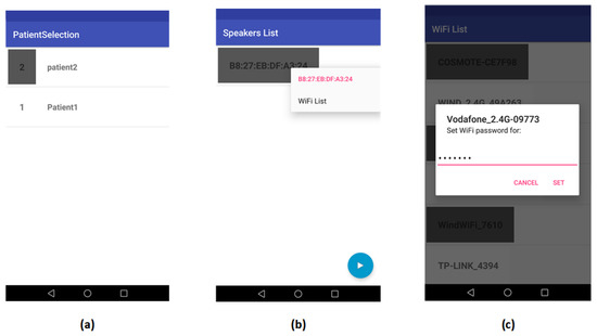 The smart phone application used by the familiar was developed using Android Studio targeting Android version Marshmallow (API Level 23) and above. The Android Studio was selected because it builds native applications for the Android platform, optimized for the targeted hardware platform. The user Familiar logs into the application, from which it is possible to select the sufferer with whom he/she will interact (it is not uncommon for relatives of sufferers to also suffer from dementia). The selection of the sufferer (Figure 9a), fetches from the application the list of speakers (Figure 9b) that have been registered by the Sufferer in the smart home. Management options for the smart speakers are included in the application. Finally, the Familiar may connect to the Wi-Fi home network (Figure 9c) to access it directly with the cloud services.