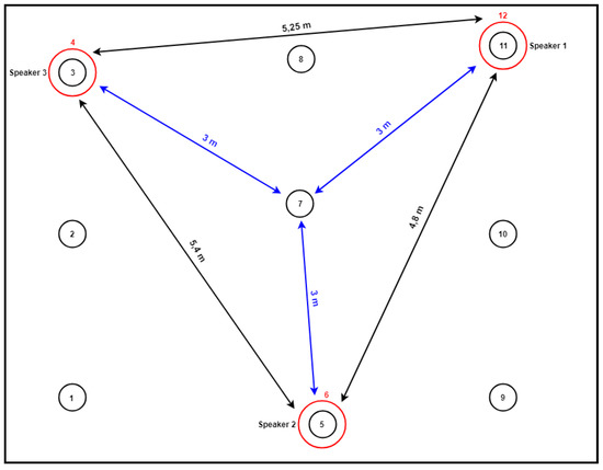 For the evaluation of the proper functionality of the system, experimental tests were carried out. The tests took place in a large, rectangular room, in which three smart speakers were placed, as seen in Figure 10. The formation of the speakers as they were placed in the room could be linked to a scalene triangle, with the two vertices of the triangle corresponding to the two corners of one wall of the room and the third vertex in the middle of the opposite wall.