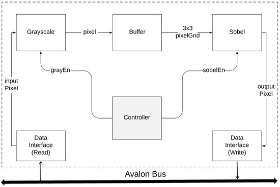 Our design contains two processing modules, Grayscale and Sobel edge detection (Figure 1). The latter utilizes the output of the grayscale as input, demonstrating chaining of different modules, in order to achieve different filter effects in a future expansion.