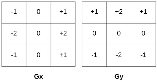 We utilized separate horizontal and vertical gradient detection kernels in the algorithm of the Sobel Edge Detector. The calculation of and is performed using the Sobel Operator. It uses a pair of 3 × 3 convolution masks (Figure 2); the first one estimates the gradient in the x (columns) and the other one the gradient in the y-direction (rows). If the pixel’s gradient direction is one of the eight possible main directions, the gradient magnitude of this pixel is compared with two of its immediate neighbors along the gradient direction. The gradient magnitude is set to zero, if it does not correspond to a local maximum of gradients. The pixel without local maximum gradient magnitude is removed as the direction of the gradient is known. The approximate absolute gradient magnitude (edge strength) at each point is computed by Equation (2).