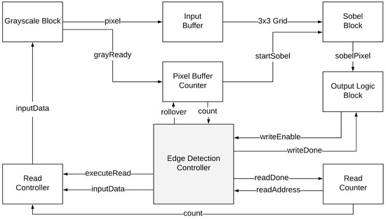 After a readDone signal is asserted, the CPU waits until the pixel is grayed. Once it is grayed, a state that controls storing the grayed pixel in a buffer is triggered. This state also waits until the buffer has enough pixels for applying the Sobel algorithm. Furthermore, the writeEnable signal is asserted and the CPU waits for the writeDone signal; then, the process restarts by retrieving a new packet. There is also an error flag, in the case anything goes wrong with reading or writing. The design flow is depicted in Figure 3.