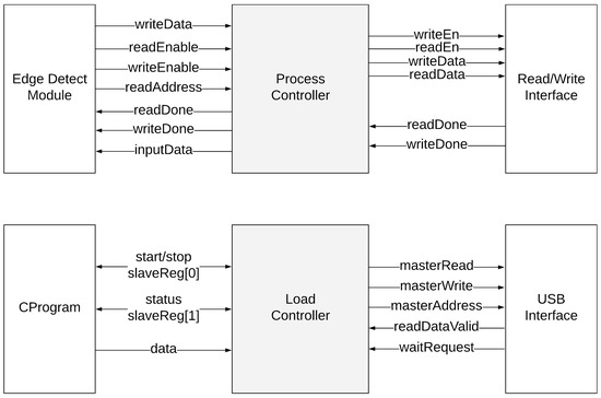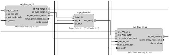 Figure 5 depicts a block diagram with the interface connections of the Edge Detection with the DMA input and output of data. Researchers have reported that, at a clock frequency of 100 MHz, data transitions may be established from both AXI4 master and AXI-Stream slave to AXI4 master at a data rate of 400 MBps and 300 MBps, respectively, being a quota of the theoretical bandwidths of 99.76% and 74.64%. These numbers were used to help us find the overhead of the data transfer between the Zynq device’s Processing System (PS) and PL [20].