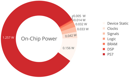 Figure 6 indicates the power consumption of our implementation, as reported by Vivado after synthesis. The static power consumption is around 0.156 watt (10%) of the total dynamic power requirements (1.383 watts). We can safely assume that, with the Zynq processing system (PS7) idle, we can expect an average power consumption of 0.5 watt and below. In comparison with other accelerators, such as that in [10], which often exceed 1.5 watts of power consumption, our implementation is about three times more energy efficient.