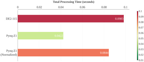 Processing time comparison between the two boards (lower is better). Normalized performance is the theoretical performance with both boards running at the same clock speed.