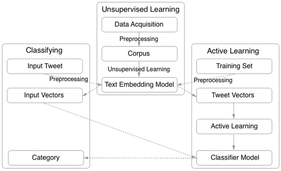 The overall approach is illustrated in Figure 1 and is quite simple. We assume that the crisis has just struck, and the user has obtained some clues from an external source (e.g., a local breaking news, or privileged first responder information). As a first step, the user has to specify some inputs so that the Twitter API can start retrieving and storing a corpus in real-time from the stream. Details on this search service may be found on the social media’s developer website; details on the API are also available. there We serialize the real-time streaming inputs by storing the tweets in the raw JSON format in which they stream, on disk, while isolating the text component and storing it in an external text file for labeling and text embedding. The former setting (storing the raw tweets) is optional in low-resource settings, where limited computational power or storage is available.