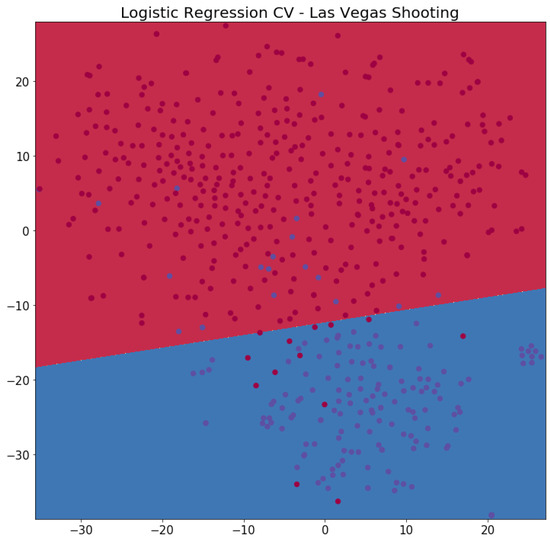 A linear classification plot based on our Las Vegas case study experiments. The blue points represent tweets relevant to the Las Vegas crisis (positive tweets), while the red points are irrelevant to the crisis (negative tweets). Note that the active learning method would not have access to this information and would pick the points closest to the line as the ‘uncertain’ data for the next iteration. The figure expresses the intuition that there is a higher density of mis-classified points closer to the line than further away.